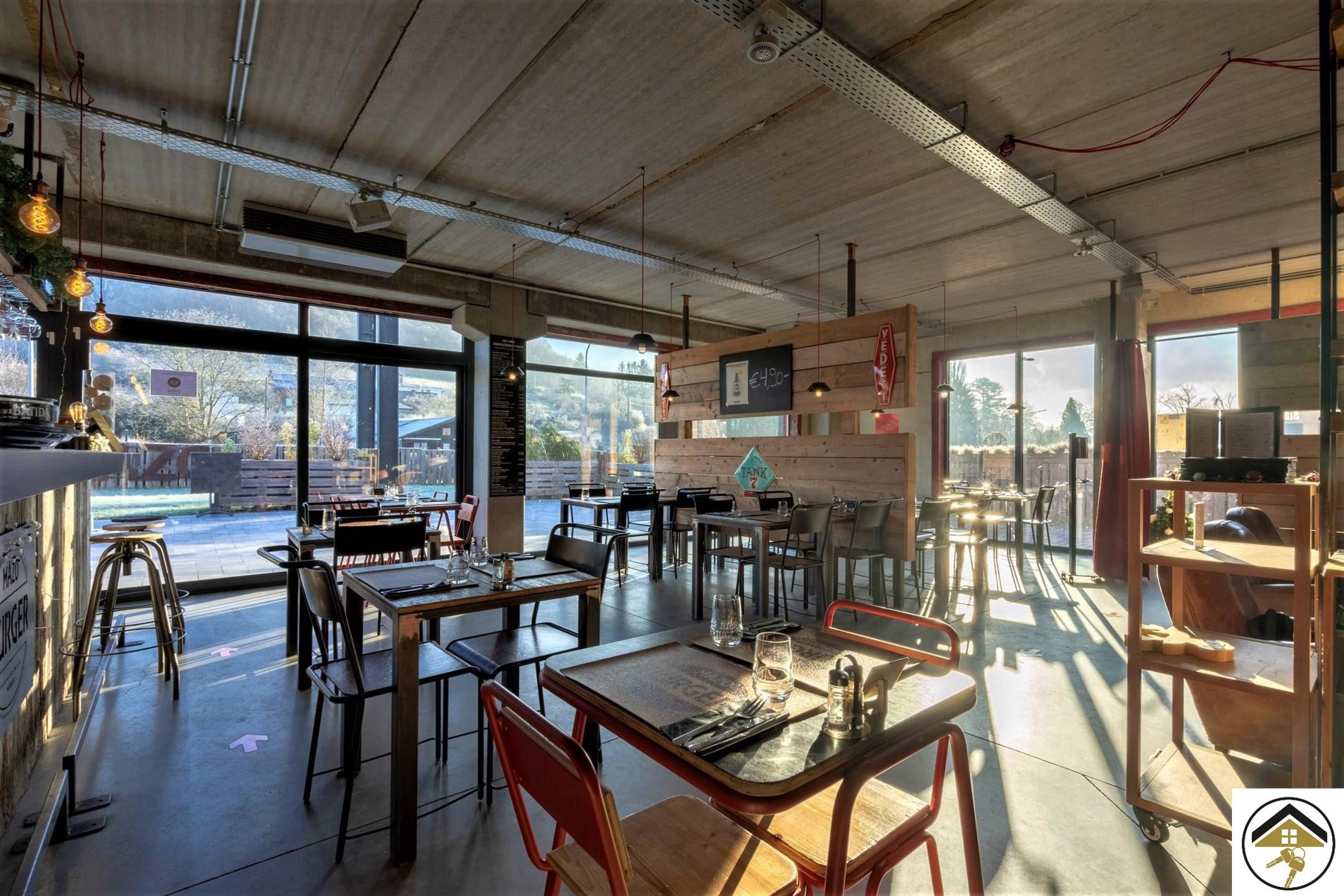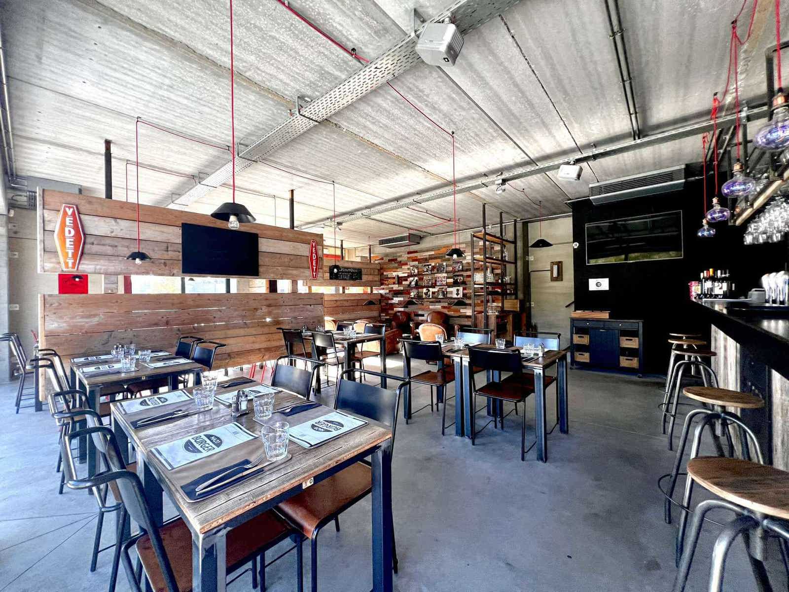 Le bâtiment se compose comme suit ; un rez de 180m² brut divisé en cuisine, réserve, bar et salle (40 couverts). A l'étage une seconde salle (45 couverts), un bar, WC homme et femme et une réserve. L'extérieur est composé de deux terrasses et d'emplacements de parking à dispositions.